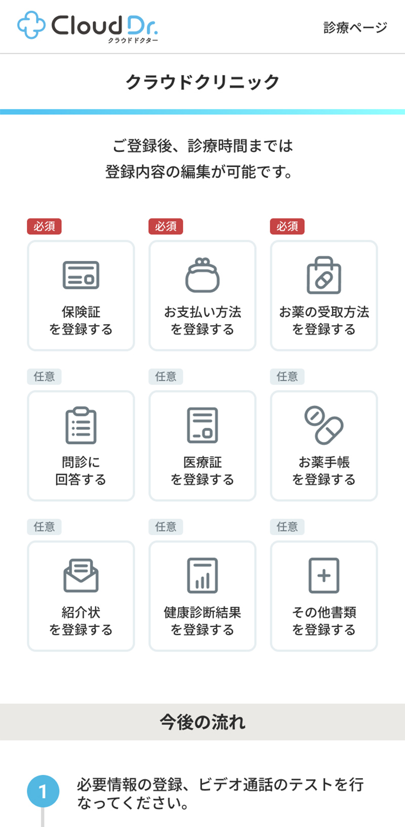 診療に必要な以下の情報について、追加登録を行います。STEP1にて受付は完了しているため、登録完了後、順番になりましたらお呼び出しします。