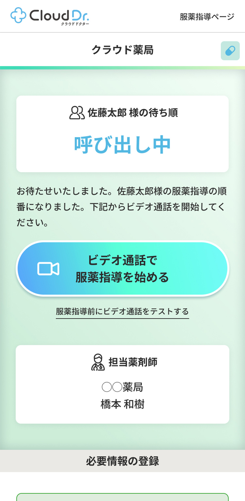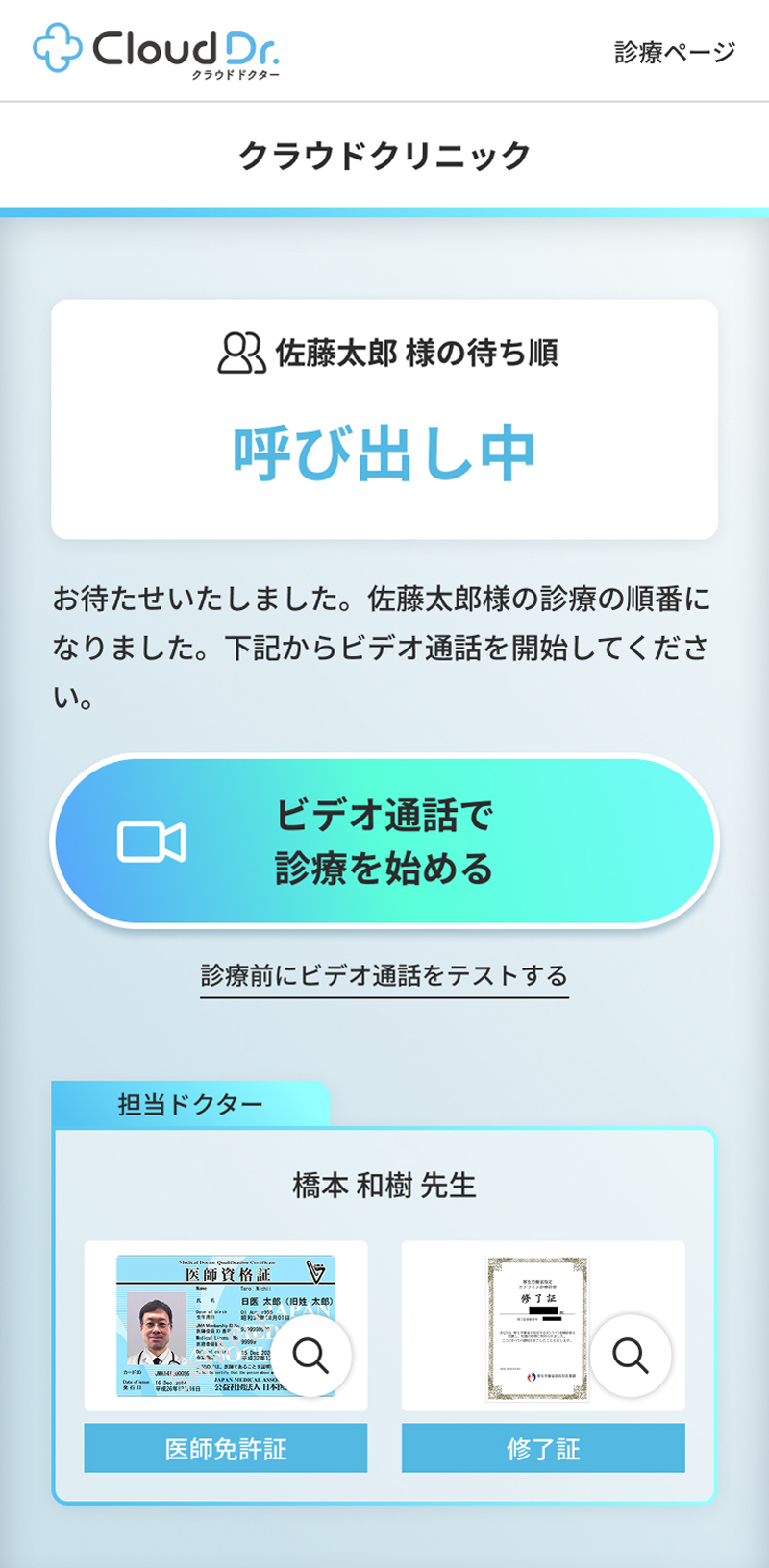 順番になりましたらSMSにてお呼び出しします。ビデオ通話のURLが記載されていますので、そちらから入室してください。