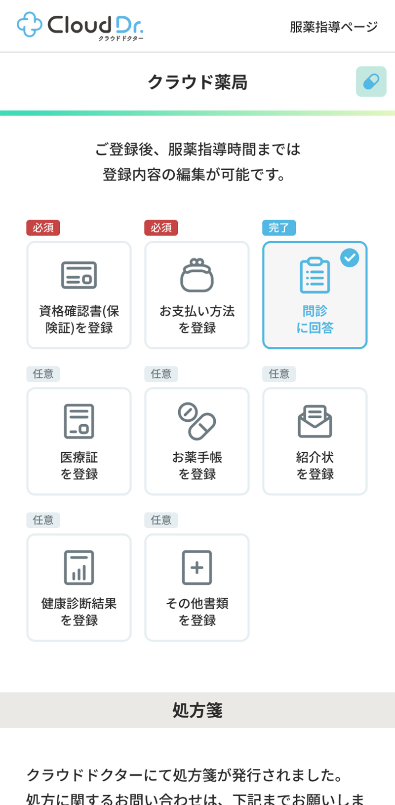 クリニックから処方箋が発行されると「オンライン服薬指導」の受付が行われます。服薬指導受付完了のSMSが届きますのでご確認ください。お薬の発送は、オンライン服薬指導後となります。